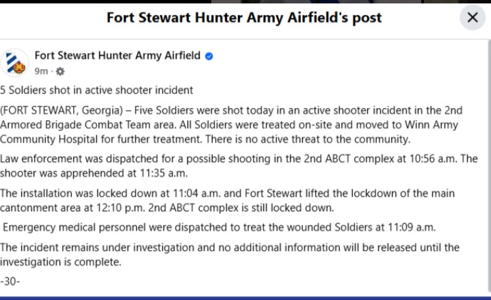 MAJOR UPDATE: Local media now reporting at least four confirmed casualties with social media users reporting seven casualties, including five claimed fatalities and other, individuals hospitalized, in an active shooter incident at Fort Stewart in Georgia.