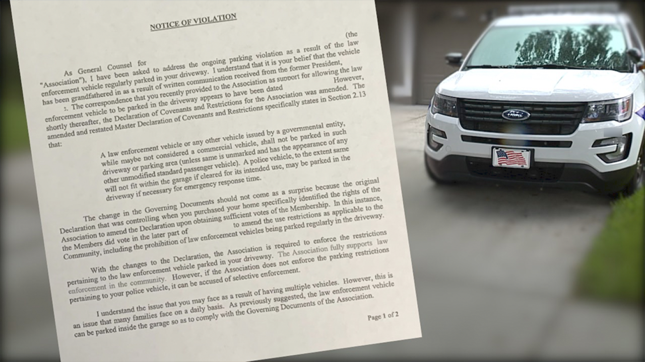 State law says HOA’s can prohibit commercial vehicles from parking in driveways but an opinion issued in 2005, by then State Attorney Charlie Crist , a law enforcement vehicle is not considered commercial.