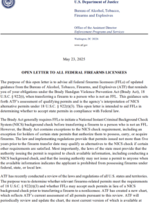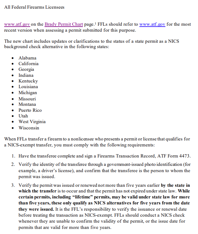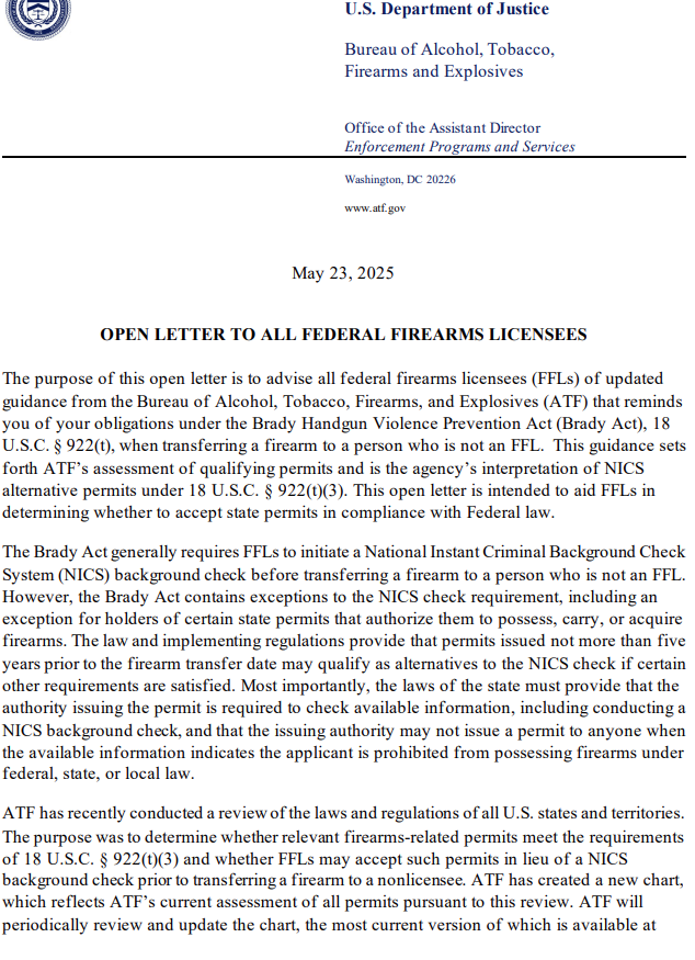 The purpose of this open letter is to advise all federal firearms licensees (FFLs) of updated guidance from the Bureau of Alcohol, Tobacco, Firearms, and Explosives (ATF) that reminds you of your obligations under the Brady Handgun Violence Prevention Act (Brady Act), 18 U.S.C. § 922(t), when transferring a firearm to a person who is not an FFL. This guidance sets forth ATF’s assessment of qualifying permits and is the agency’s interpretation of NICS alternative permits under 18 U.S.C. § 922(t)(3). This open letter is intended to aid FFLs in determining whether to accept state permits in compliance with Federal law