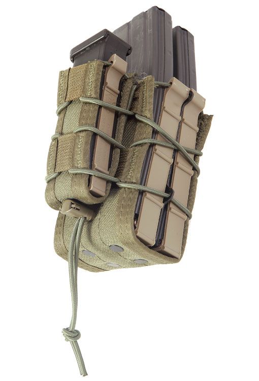 This unique pouch uses injection molded polymer sides, Cordura™ front and back, and shock cord lacing to lock just about any rifle magazine into place. USGI, HK, PMAG, ARC, FAL, AK 30/ 40, LR20 and M14 magazines are all held securely and deployed easily and silently on demand.