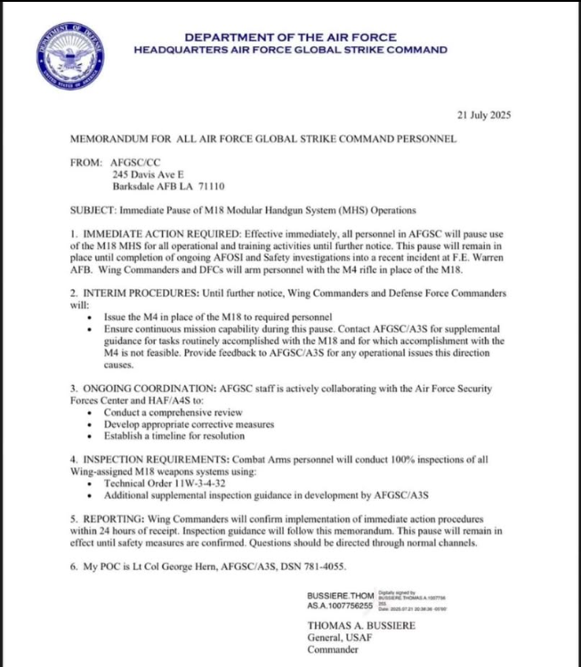 As part of the response, Security Forces combat arms airmen across all Global Strike Command bases are conducting 100% inspections of M18 handguns to identify potential safety issues. The pause in M18 use is effective “until further notice” and currently applies only to the Global Strike Command, which oversees more than 33,700 personnel.
