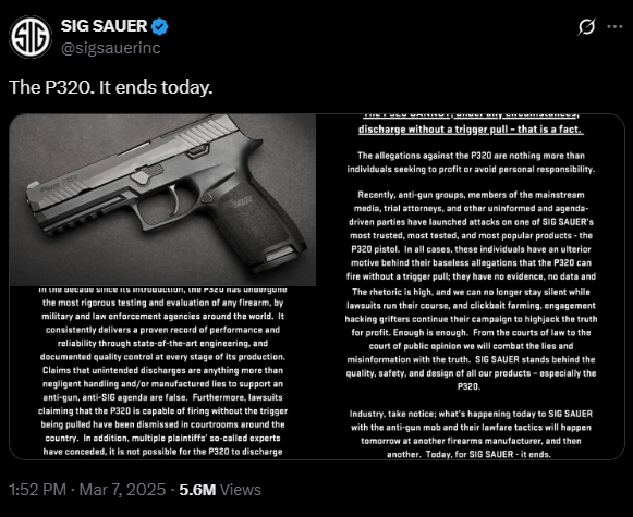 Since its introduction in 2014, the P320 has been adopted as the M17 and M18 pistols by the U.S. military. In 2017, Sig Sauer offered a “voluntary upgrade” to reduce trigger weight, but critics, including lawyers representing plaintiffs in lawsuits, argue that this did not resolve the issue of unintentional discharges.