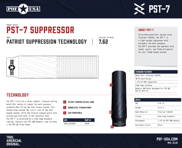 If you’re building or upgrading a suppressed .308/7.62 setup — especially on a POF rifle — the PST-7 looks like a no-brainer “made by Patriots, for Patriots” addition. Full specs and real-world testing (dB ratings, back-pressure comparisons) should roll out soon post-SHOT.