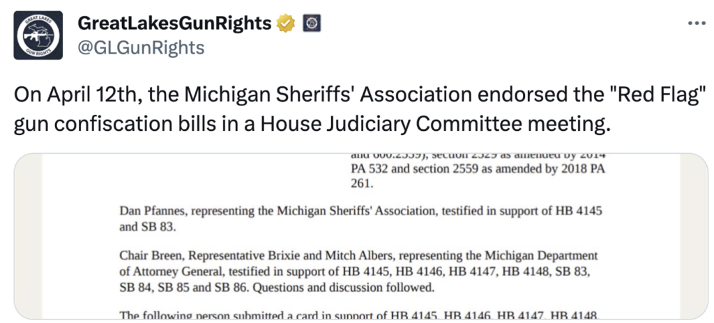 Pfannes is the Deputy Director of the MSA. Back in April, while the bill was still being debated in the House Judiciary Committee, he spoke in favor of the then-proposed red flag provision. So the Michigan Sheriffs’ Association’s reservations regarding the enforcement implications of red flag confiscation orders did not prevent the MSA from supporting the bill’s passage.