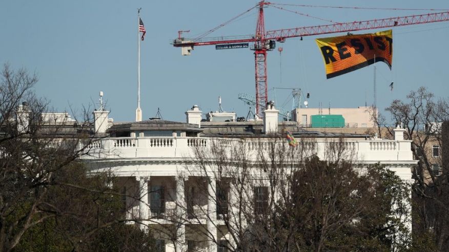 The banner encouraging opposition to President Donald Trump’s agenda was clearly visible from the grounds of the White House for several hours on Wednesday.