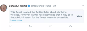 Twitter has placed a public interest notice on a tweet from President Trump for breaking the platform’s rules about the “glorification of violence.” However, Twitter has not chosen to remove the tweet from its platform entirely, because it believes it to be in the public interest. Twitter announced the notice in a tweet thread from its official comms account.
