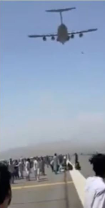 A man was seen falling from a plane leaving the Kabul International Airport today during the chaos in Afghanistan.