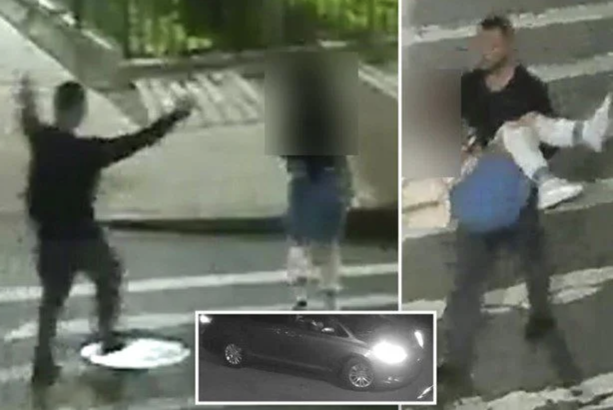 The images show the man approaching the woman with his arms outstretched before grabbing her and hauling her away.