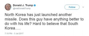 Trump tweeted Monday night: ‘North Korea has just launched another missile. Does this guy have anything better to do with his life? Hard to believe that South Korea and Japan will put up with this much longer. Perhaps China will put a heavy move on North Korea and end this nonsense once and for all!’